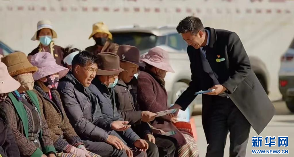 ??工作人員阿旺旦增為扎洞村群眾宣講金融知識,并介紹“庭院經(jīng)濟貸”相關(guān)業(yè)務(wù)。(中國農(nóng)業(yè)銀行股份有限公司山南分行供圖)