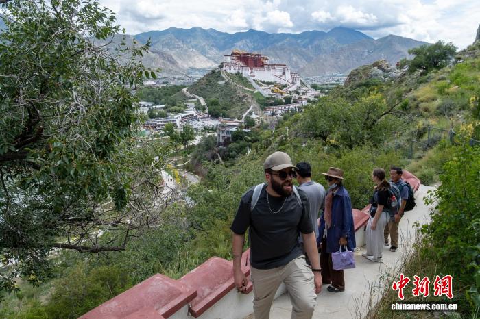 8月4日,外籍游客登上拉薩團(tuán)結(jié)公園藥王山步道。中新社記者 江飛波 攝