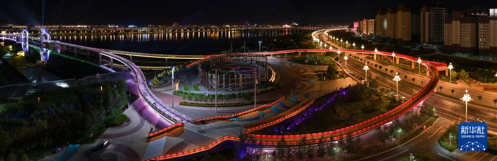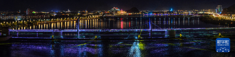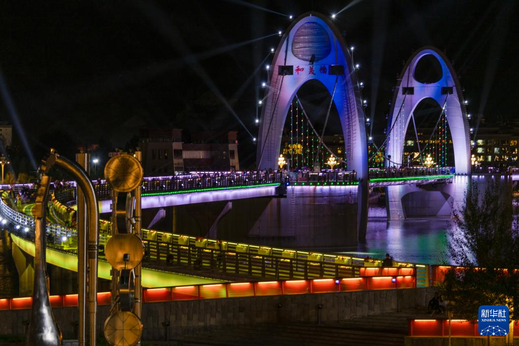 這是7月30日拍攝的拉薩河夜景,由近及遠分別是和美橋、柳梧大橋和連心橋(無人機拼接照片)。新華社記者 姜帆 攝 ??