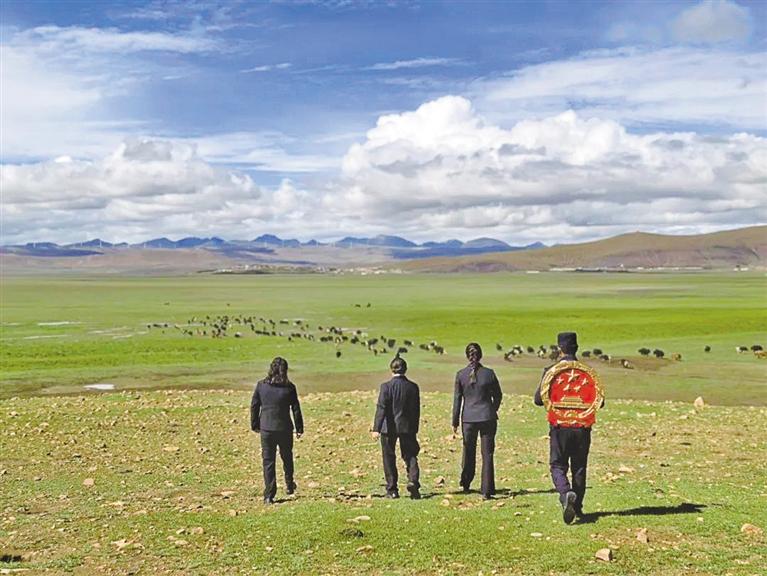 在廣袤的草原深處,牧民群眾的黑帳篷與成群的牛羊構(gòu)成人與自然和諧共生的畫卷。措美縣人民法院干警來到放牧點,圍坐于牧民群眾間,用通俗易懂的語言打開話匣子?!按笫?,您看這草場上的植被,要是過度放牧,來年就長不出這么好的草了,牛羊沒了口糧,咱們的日子也受影響不是?”