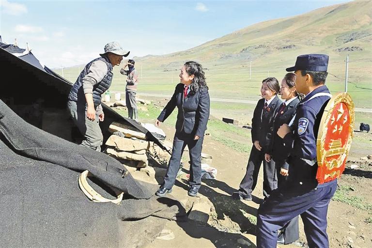 措美縣人民法院干警向放牧點群眾宣傳法律知識。