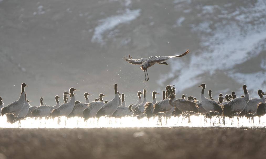 黑頸鶴主要棲息在高原海拔2500米至5000米的草甸、沼澤地帶,是世界上唯一生長、繁殖在高原的鶴類,也是國家一級保護(hù)動(dòng)物,有“高原仙子”的美稱。每年3月中下旬,黑頸鶴向北方各繁殖地遷徙;10月,開始結(jié)群帶領(lǐng)幼鳥南遷至西藏林周等地越冬。
