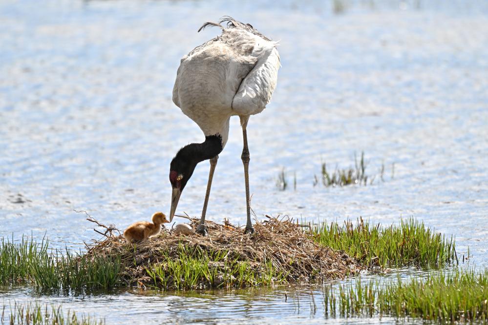 2025年6月5日,這是在西藏那曲市申扎縣拍攝的黑頸鶴和雛鳥。新華社記者孫瑞博 攝