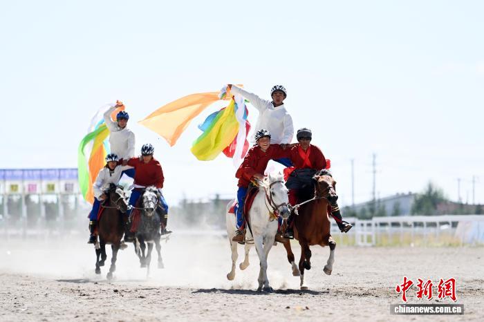 8月13日,九色甘南香巴拉·瑪曲第十六屆格薩爾賽馬會在甘肅甘南藏族自治州瑪曲縣格薩爾賽馬中心開幕。來自貴州、西藏、青海、四川、甘肅等省區(qū)的45支參賽隊962匹駿馬在瑪曲草原上展開為期5天的角逐。圖為開幕式現(xiàn)場馬術(shù)表演。中新社記者 九美旦增 攝