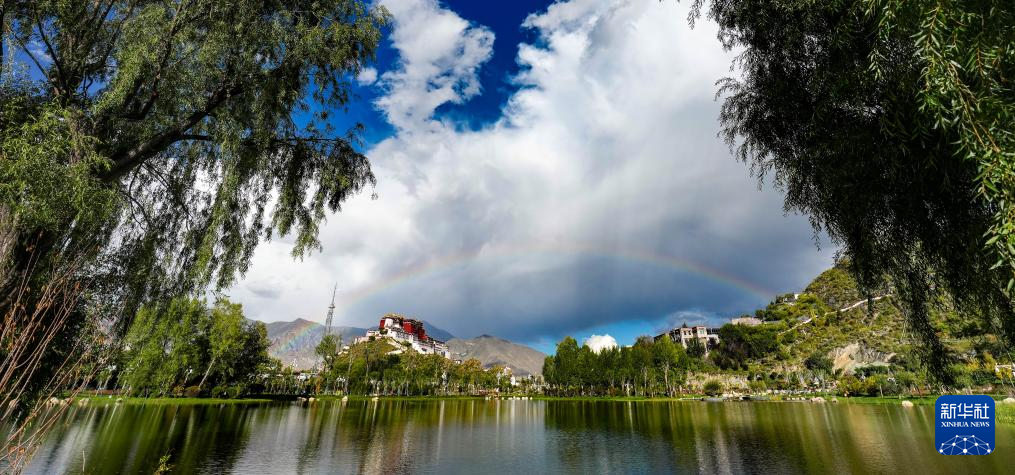 從拉薩團結(jié)公園遠眺彩虹下的布達拉宮(9月21日攝)。新華社記者 晉美多吉 攝