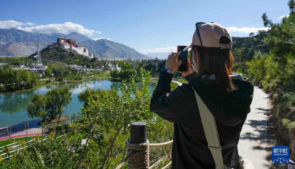 9月25日,在拉薩團結(jié)公園旁的藥王山步行道上,一名游客拍攝美景。新華社記者 晉美多吉 攝 ??