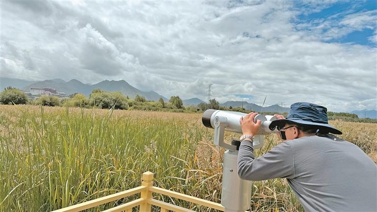 市民在拉魯濕地公園內(nèi)通過望遠鏡觀賞布達拉宮。