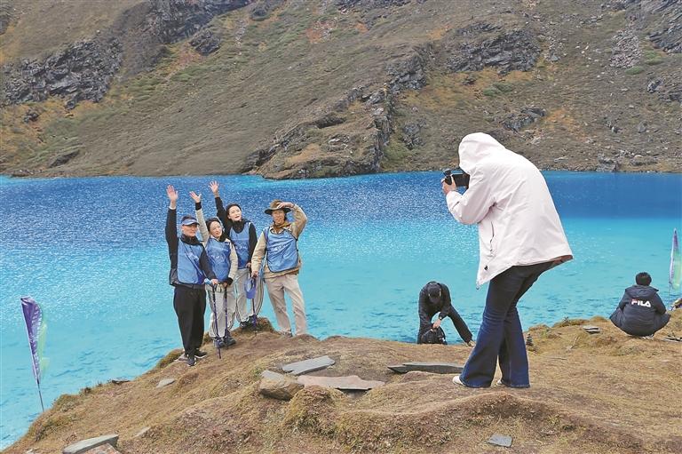 近年來,古如拉措憑借獨(dú)特的“愛心藍(lán)寶石”自然景觀,成為徒步愛好者的向往之地。本次2.5公里的徒步路線地質(zhì)景觀豐富多變,參賽者依次穿越灌木叢、荊棘林、裸露石、山脊線等?!暗诌_(dá)愛心湖時(shí),那片湛藍(lán),瞬間消減了我所有疲憊?!眳①愓咤?dòng)地說。