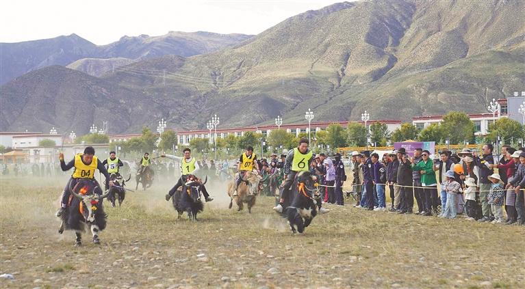 10月1日,拉薩市墨竹工卡縣賽牛場舉辦獨(dú)具特色的牦牛競速賽,為游客和群眾呈現(xiàn)了一場力量與速度的較量。圖為激烈的比賽現(xiàn)場。記者 格桑倫珠 攝