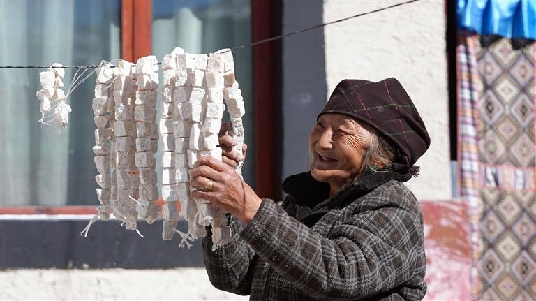 74歲的洛桑塔杰坐在庭院里,正專注地編織牦牛項(xiàng)圈。彩色繩線在他指尖翻飛纏繞,漸漸勾勒出別致紋路。不遠(yuǎn)處,他的老伴在晾曬奶渣,潔白的顆粒在陽光下泛著誘人光澤,兩位老人的臉上滿是藏不住的幸福笑意。“家里170多頭牲畜由兒女照管,我們閑時(shí)就做點(diǎn)手工活解悶。” 洛桑塔杰笑著打開話匣子,“今年多虧村委會(huì)發(fā)放了7頭適齡母牦牛,還帶領(lǐng)大家加入村集體牦牛養(yǎng)殖項(xiàng)目。我學(xué)會(huì)了科學(xué)飼養(yǎng)技術(shù),年底能分紅,牛奶、酥油、奶渣自己吃不完還能賣,日子過得充實(shí)又紅火!”