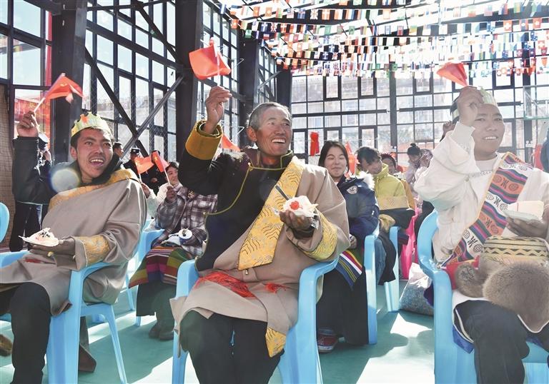 而在距離活動(dòng)現(xiàn)場(chǎng)不到一公里的郭加鄉(xiāng)切村農(nóng)村幸福院,工作人員組織了一場(chǎng)集體生日,老人們也正捧著蛋糕,開(kāi)心地品嘗著。