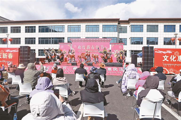 隨后,在社區(qū)劇場內,雅礱扎西雪巴藏戲精彩上演。演員們頭戴面具、身著華麗戲服,以高亢嘹亮的唱腔和富有張力的動作,演繹著古老傳說。舞臺下,游客們或舉起手機記錄精彩瞬間,或隨著節(jié)奏輕輕拍手,沉浸在這場獨具藏式風情的“村晚”之中,劇場里洋溢著歡樂祥和的節(jié)日氛圍。