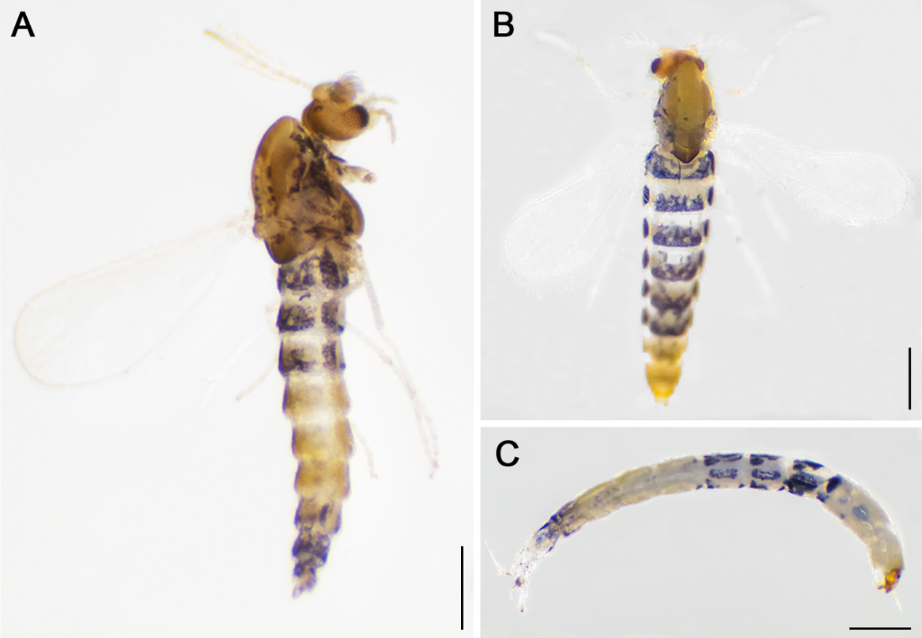 圖為墨脫流施密搖蚊整體照:A為雄成蟲、B為雌成蟲、C為幼蟲。(西藏自治區(qū)高原生物研究所“達(dá)娃創(chuàng)新工作室”供圖)