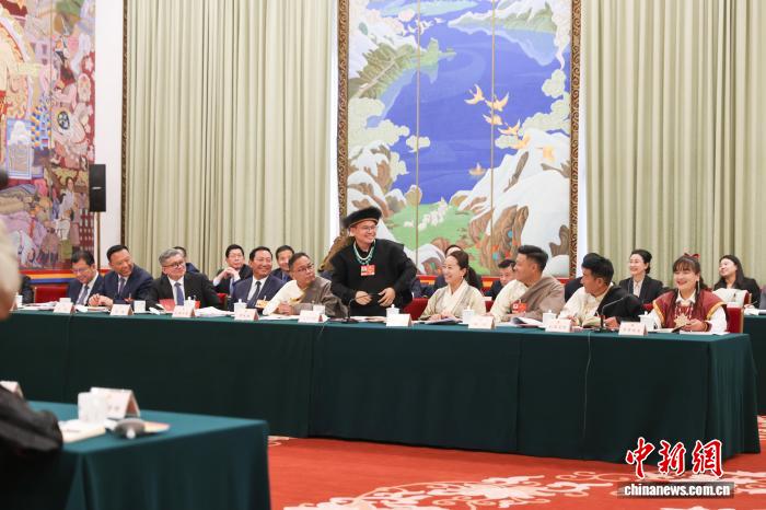 3月6日,全國人大代表扎西江村(中間起立者)身著珞巴族服飾,出席十四屆全國人大四次會議西藏代表團開放團組會議。中新社記者 楊郁然 攝