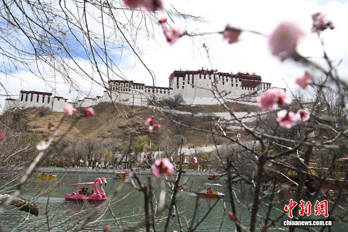 3月8日,西藏拉薩宗角祿康公園,市民乘游船賞春。陽(yáng)春三月,古城拉薩楊柳發(fā)芽、桃花初放,春意漸濃。中新社記者 貢嘎來松 攝