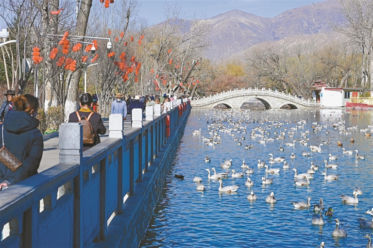 圖為市民漫步湖畔,與候鳥近距離接觸。記者 索朗旺久 攝