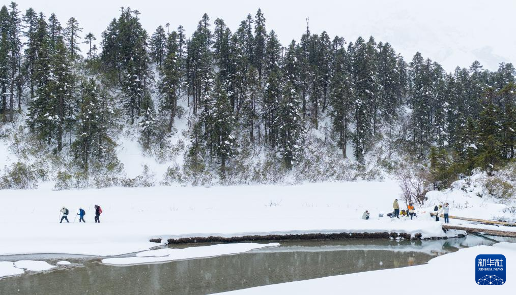 游人在白普隆溝牧場(chǎng)感受雪景(3月21日攝,無(wú)人機(jī)照片)。新華社記者 普布次仁 攝