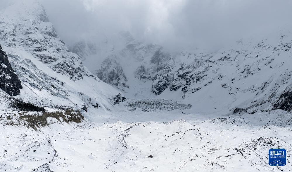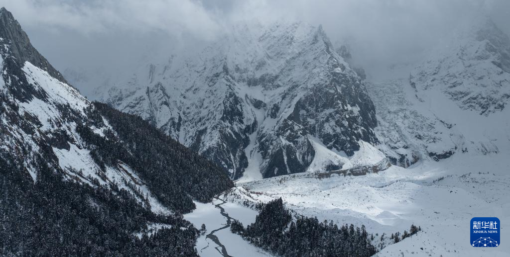 大雪覆蓋的白普隆溝(3月21日攝,無(wú)人機(jī)照片)。新華社記者 洛卓嘉措 攝