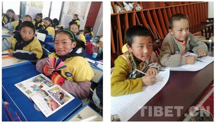 圖為西藏自治區(qū)那曲市比如縣羊秀鄉(xiāng)小學(xué)的孩子們?cè)谏鲜止ふn(左)和書(shū)法課(右) 攝影:米瑪旺久