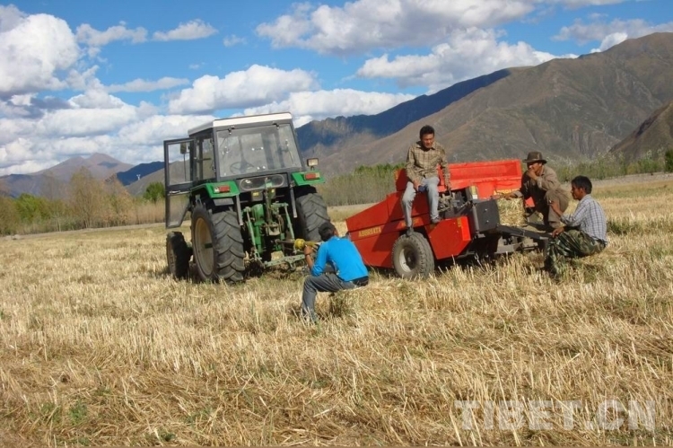 圖為西藏自治區(qū)農(nóng)牧科學院草業(yè)科學研究所科技人員正在開展飼用燕麥青干草打捆試驗示范