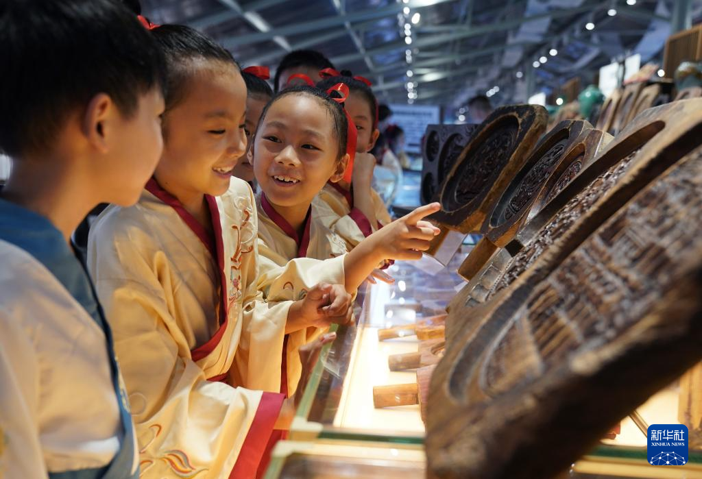9月11日,孩子們?cè)趨⒂^傳統(tǒng)手工糕餅?zāi)>?。新華社記者 萬(wàn)象 攝