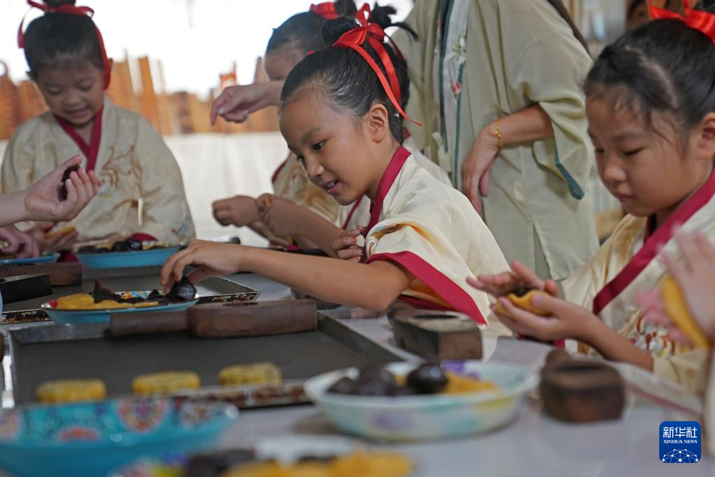 9月11日,孩子們?cè)诨顒?dòng)上體驗(yàn)傳統(tǒng)手工月餅制作。新華社記者 萬(wàn)象 攝