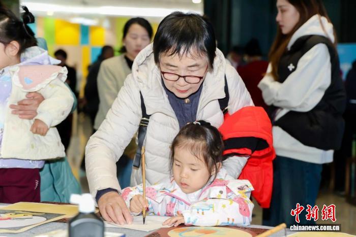 當(dāng)天,宋慶齡青少中心一層中庭熱鬧非凡,書法、國畫、版畫三大傳統(tǒng)藝術(shù)體驗(yàn)區(qū)同步開放,吸引眾多長輩參與。書法區(qū)墨香陣陣,“?!薄皦邸薄爸仃柊部怠钡扰R摹帖整齊擺放,長者握筆書寫,教師在一旁細(xì)心指導(dǎo)握筆姿勢,不少作品中留下了對晚輩的溫情祝福。