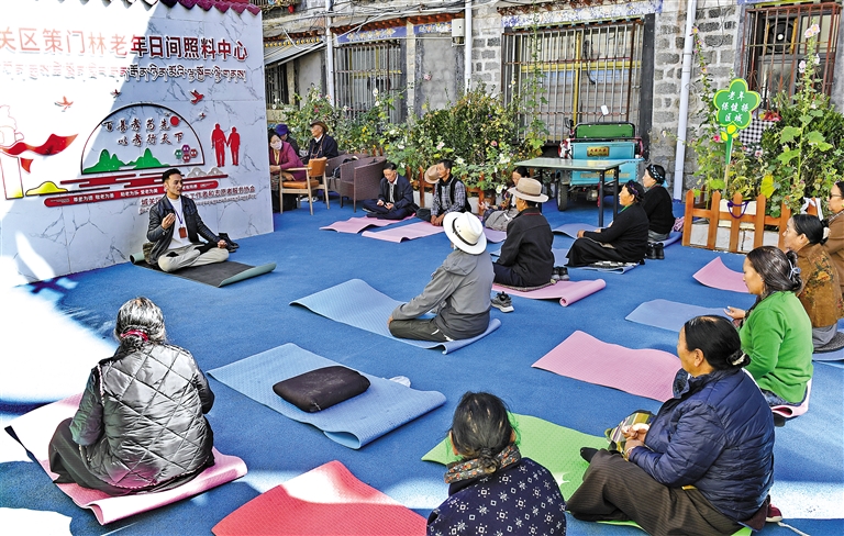 圖為拉薩市城關區(qū)策門林老年日間照料中心舉辦培訓,教老人們練習瑜伽。記者 旦增蘭澤 攝