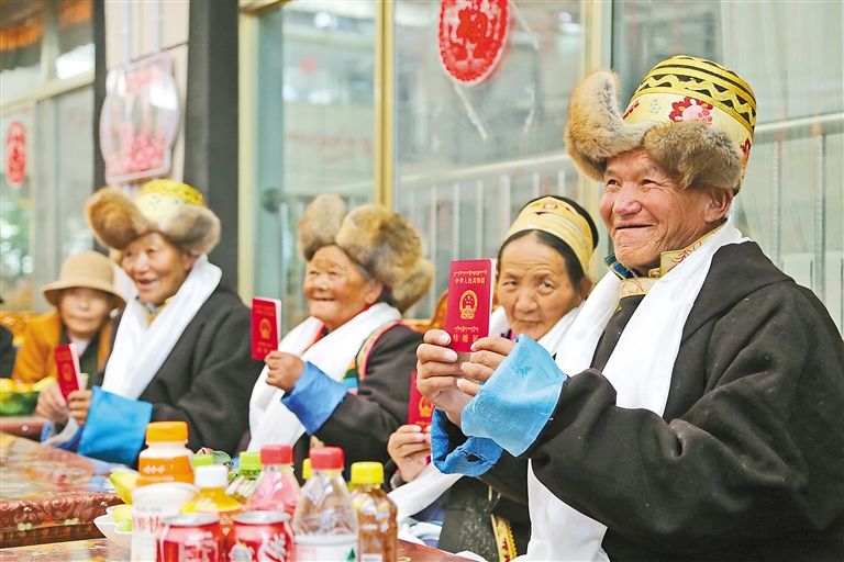圖為山南市瓊結縣特困人員集中供養(yǎng)服務中心的“新人”阿南高興地展示自己的結婚證。記者 白瑪澤旺 通訊員 倫珠澤旺 攝
