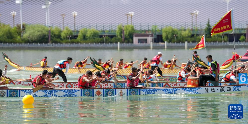 當日,2025年西藏自治區(qū)端午節(jié)牛皮船(龍舟)賽在拉薩濱河公園水域舉行。來自全國各地的160名選手組成的10支龍舟隊伍和20支牛皮船隊伍同在高原競渡,吸引眾多觀眾到場觀看。