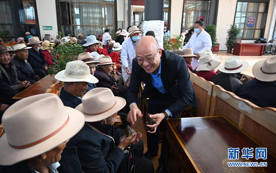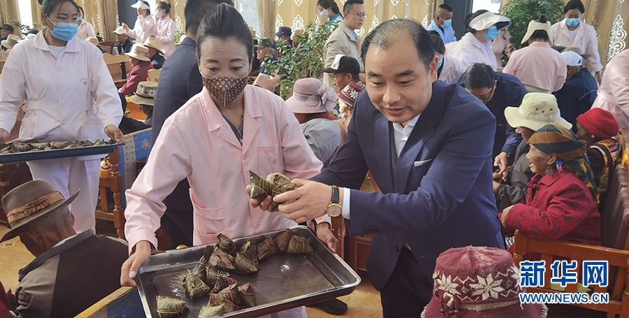 6月3日,在西藏山南市集中供養(yǎng)服務(wù)中心,安徽第七批援藏工作隊(duì)隊(duì)長(zhǎng)汪華東為孤寡老人送上粽子。新華網(wǎng) 王雷 攝