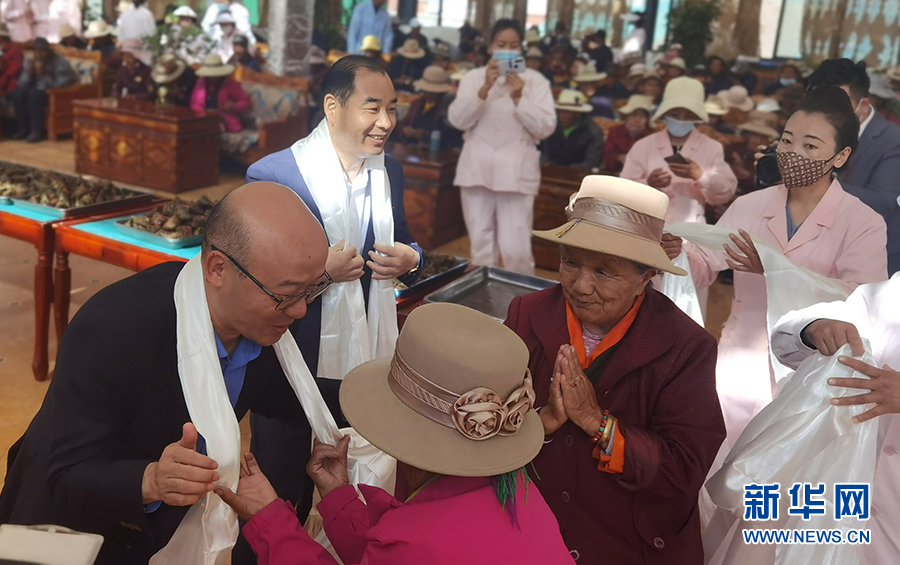 6月3日,西藏山南市集中供養(yǎng)服務(wù)中心內(nèi),老人向安徽第七批援藏工作隊(duì)的隊(duì)員獻(xiàn)上潔白的哈達(dá)。新華網(wǎng) 王雷 攝