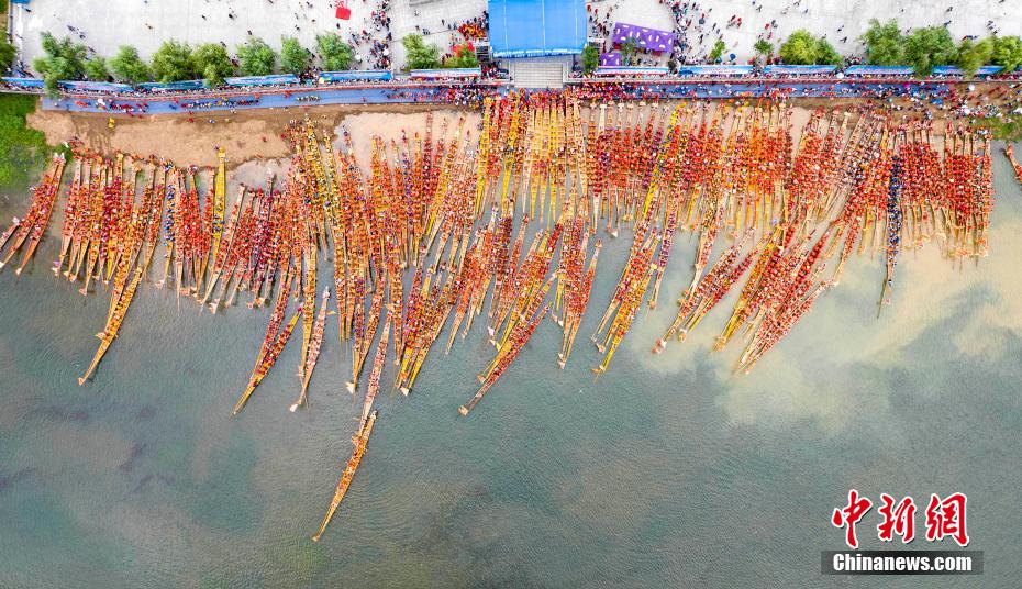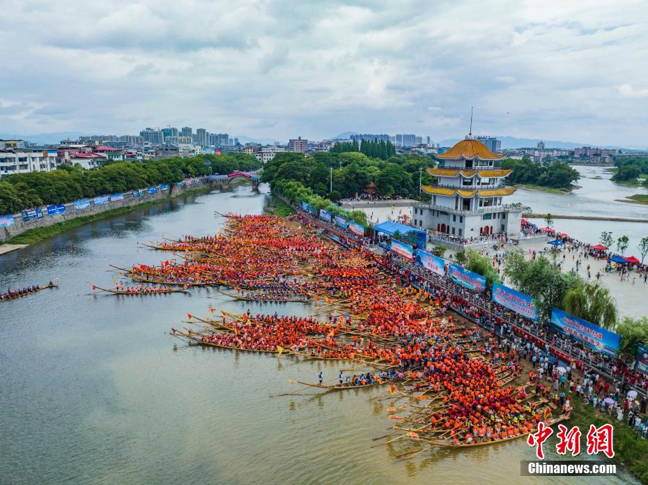 18日,“理傳千年 龍騰四?!焙嫌乐菔械揽h2023年端午節(jié)“紫金杯”國家非遺龍船賽在該縣瀟水河畔鳴鑼開賽。此次國家非遺道州龍船賽吸引該縣12個鄉(xiāng)鎮(zhèn)(街道)、73個村(社區(qū))、172艘龍船、4816名民間運動員參賽。圖為172艘龍船、4816名民間運動員參賽。