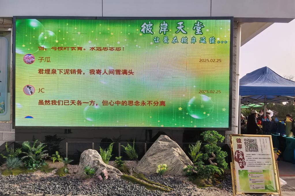 在園區(qū)入口處,一塊滿載哀思的電子屏幕引人駐足,這是網(wǎng)絡(luò)祭掃空間——“彼岸信箱”,逝者親屬只需通過微信平臺(tái),便能將心底的牽掛發(fā)送給親人;“云祭掃”服務(wù)專區(qū)同步開設(shè),市民可通過線上平臺(tái)獻(xiàn)花、留言,實(shí)現(xiàn)低碳祭掃。