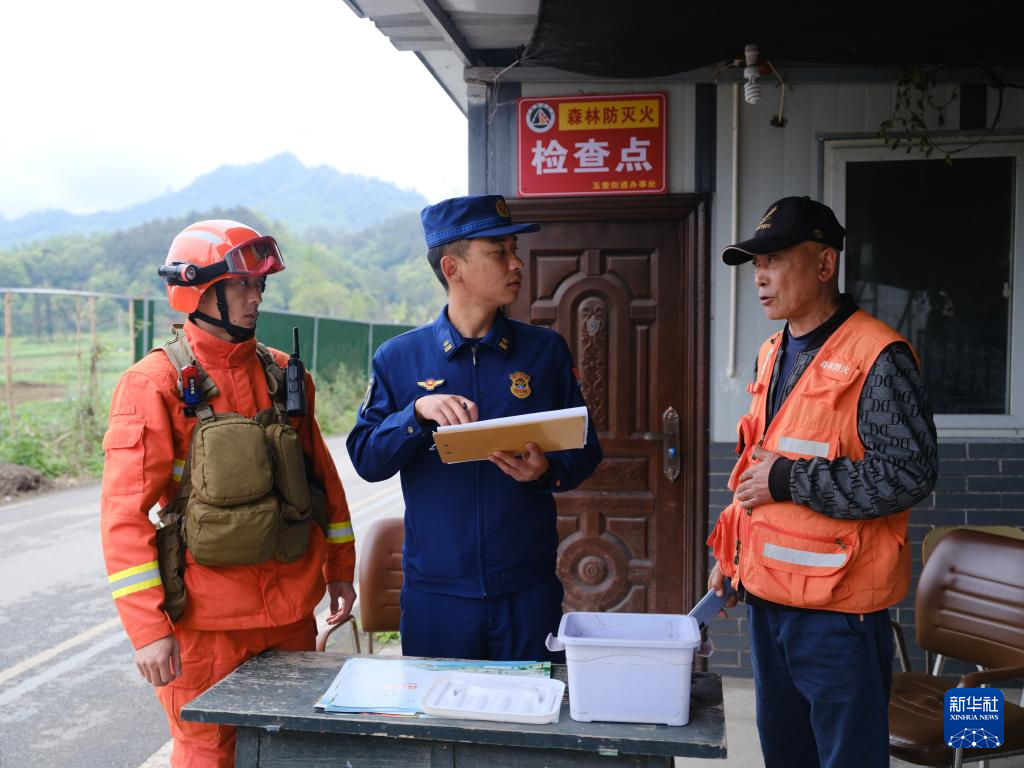 3月29日,消防救援人員(左、中)在都江堰林區(qū)入口進(jìn)行防火檢查。