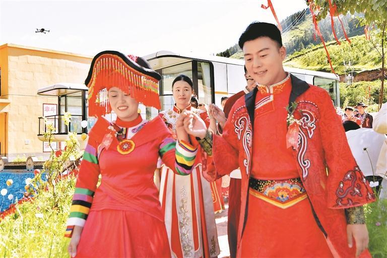 當(dāng)天,在觀眾的祝福下,22對(duì)夫婦共進(jìn)“七夕情人康養(yǎng)餐”,漫步情人林,體驗(yàn)原生態(tài)土族婚禮,品鑒非物質(zhì)文化遺產(chǎn)土族圈圈席,觀看大型原創(chuàng)歌舞劇《彩虹部落》,沉浸式感受了一場(chǎng)融合秀美自然風(fēng)光、多民族婚俗、非遺技藝展示、歌舞展演的七夕盛宴。