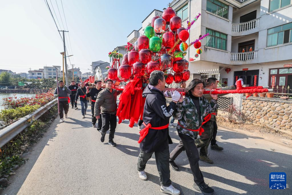 當日是農歷正月十三,浙江省金華市金東區(qū)赤松鎮(zhèn)虎巖村村民肩扛由100余節(jié)板凳組成的傳統(tǒng)五彩龍燈,沿村道蜿蜒游舞。