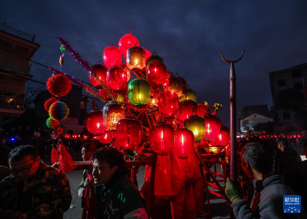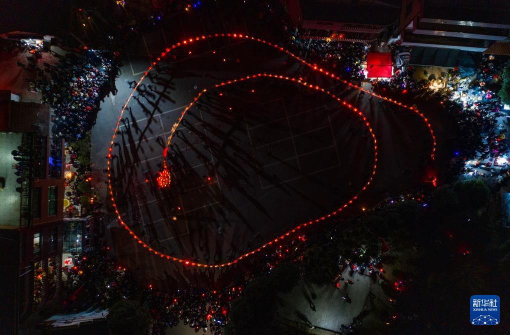 當日是農(nóng)歷正月十三,浙江省金華市金東區(qū)赤松鎮(zhèn)虎巖村村民肩扛由100余節(jié)板凳組成的傳統(tǒng)五彩龍燈,沿村道蜿蜒游舞。板凳龍的龍頭被彩燈包裹,裝飾有花卉、祥云等圖案,在燭光搖曳間營造出“龍騰盛世”的年俗畫卷。每年元宵節(jié)前后,浙江省金華市金東區(qū)赤松鎮(zhèn)的各村村民都會舞起板凳龍燈,祈求來年風調(diào)雨順、五谷豐登。