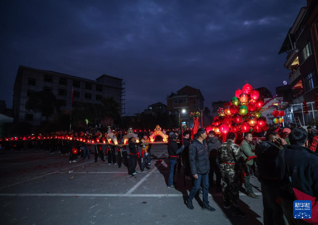 2月10日,赤松鎮(zhèn)虎巖村村民抬著板凳龍在村里巡游。