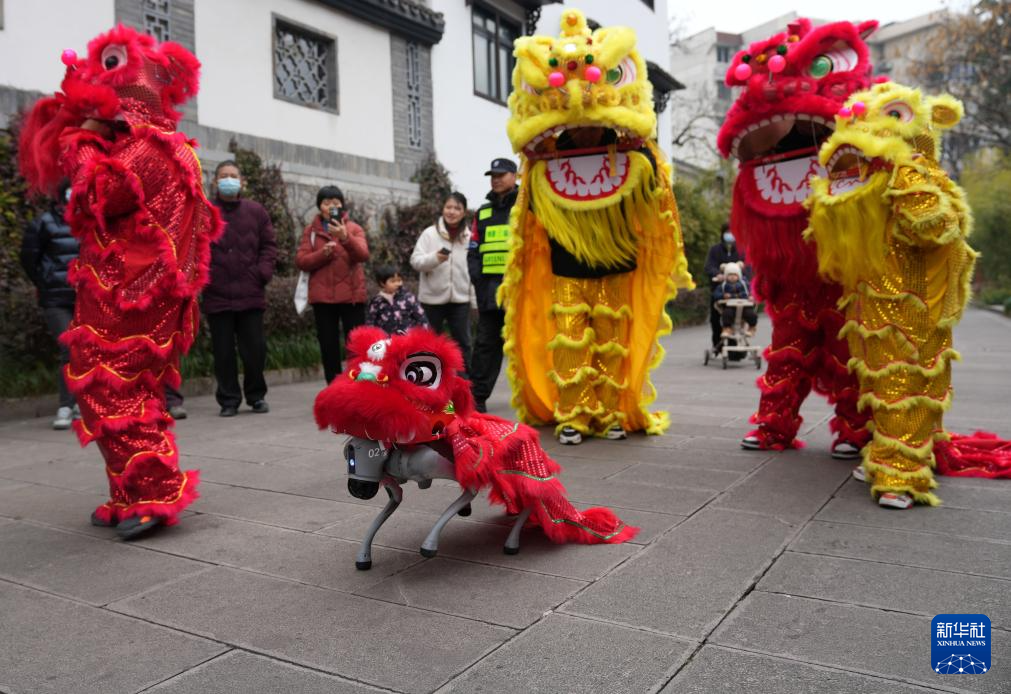 2月11日,在浙江杭州市西湖區(qū)北山街道元宵文化廟會活動中,機器狗與演員一起為社區(qū)居民進(jìn)行舞獅表演。
