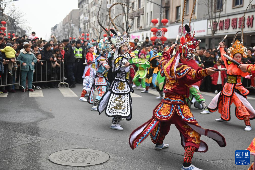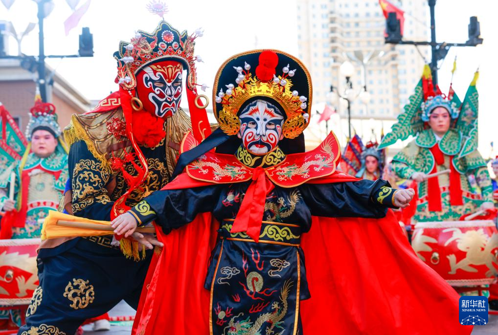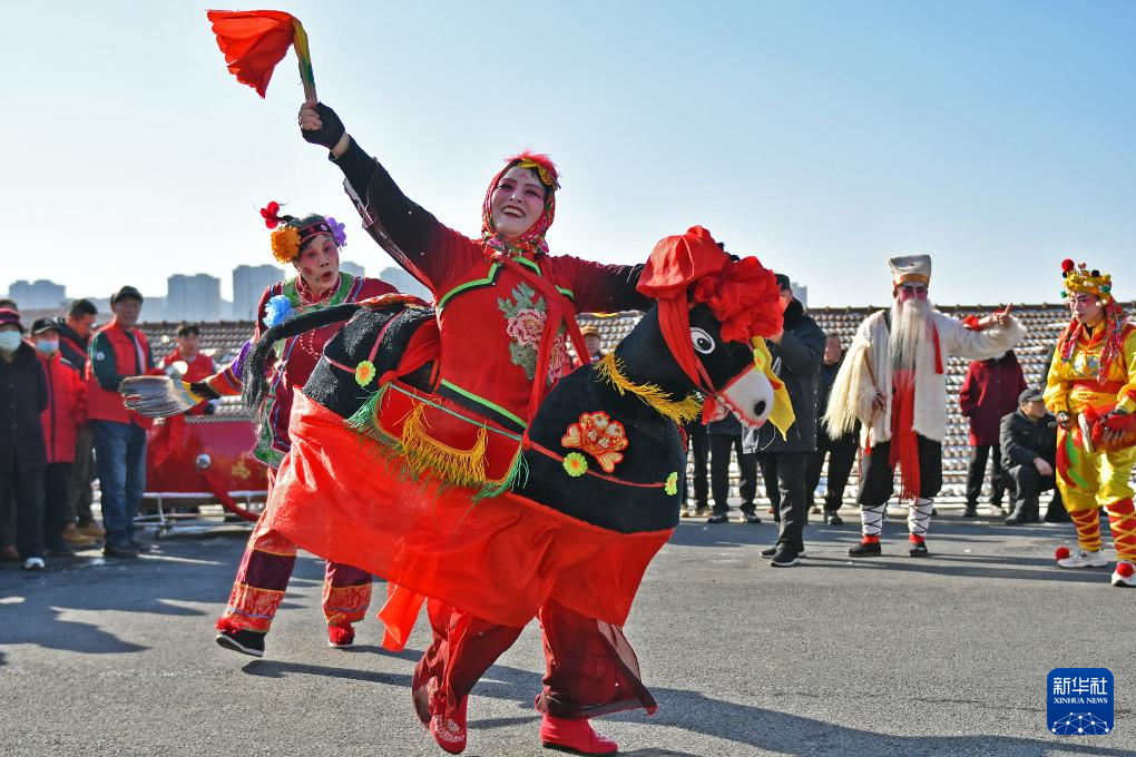 2月11日,民間藝人在河北省遵化市華明路街道表演民俗節(jié)目。