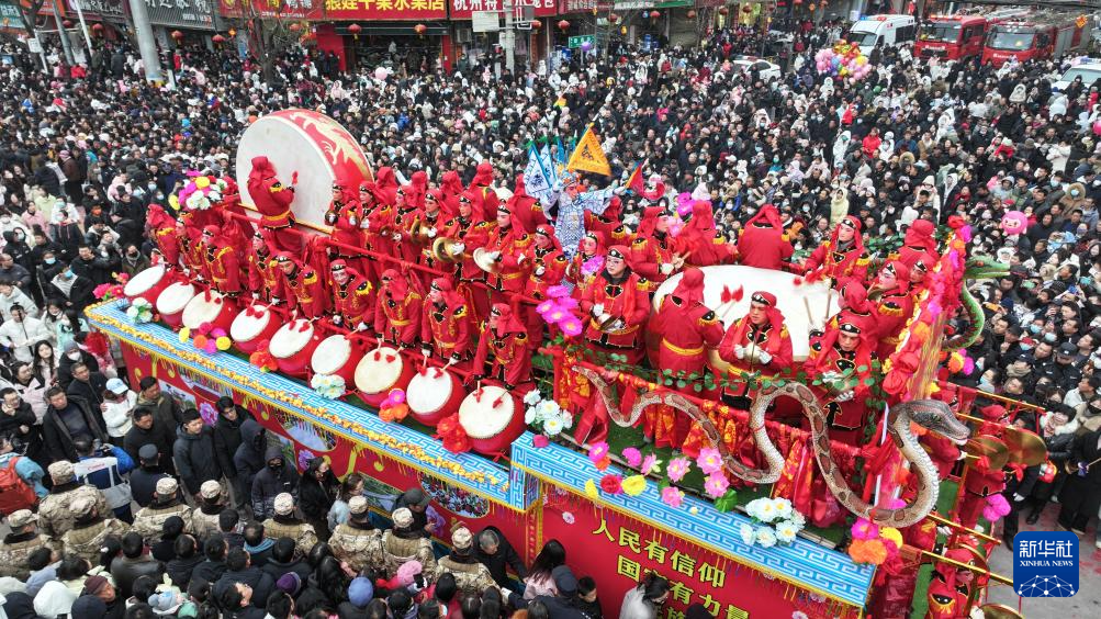 2月9日,在甘肅省平?jīng)鍪星f浪縣“龍騰盛世·歡樂莊浪”第二十一屆民間文化藝術(shù)節(jié)上,群眾觀看巡游的彩車(無人機照片)。