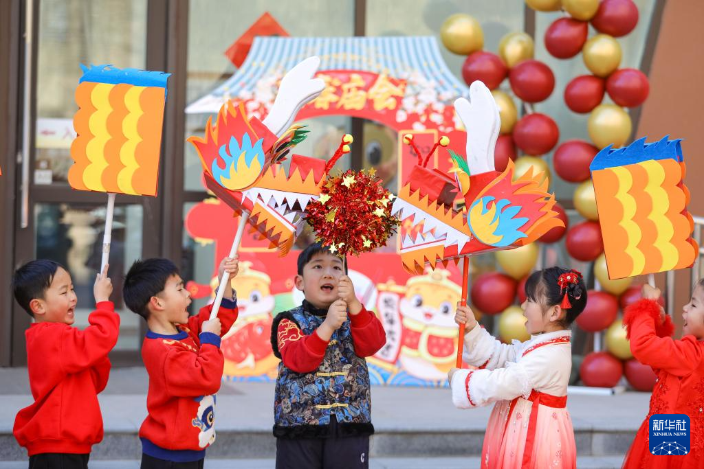 2月10日,小朋友在山東省青島市李滄區(qū)九水東路幼兒園開展的民俗活動中進(jìn)行舞龍表演。