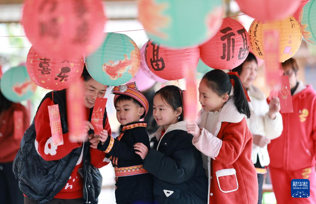 2月10日,人們在廣西桂林市靈川縣蘭田瑤族鄉(xiāng)西江寨參與猜燈謎活動。