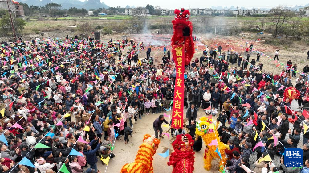 2月9日,廣西柳州市柳江區(qū)進(jìn)德鎮(zhèn)四連村土垢屯,村民在客家“上燈節(jié)”活動上進(jìn)行舞獅表演(無人機照片)。