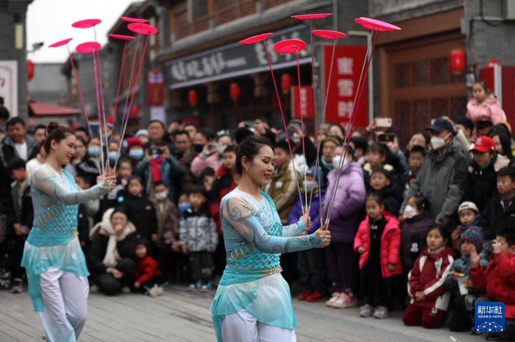 2月11日,在河北省滄州市運河區(qū)南川老街景區(qū),民間藝人為游客表演雜技節(jié)目《轉(zhuǎn)花碟》。