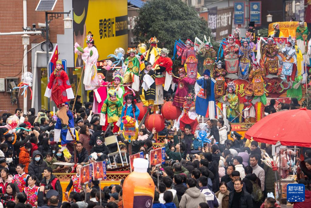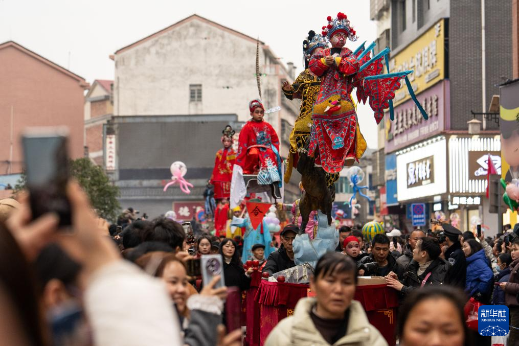 2月11日,在湖南省汨羅市長樂鎮(zhèn),人們參加抬閣故事會。“長樂抬閣故事會”是長樂鎮(zhèn)當(dāng)?shù)匾豁梻鞒星甑脑?jié)民俗活動,2011年入選國家級非物質(zhì)文化遺產(chǎn)擴展項目名錄。