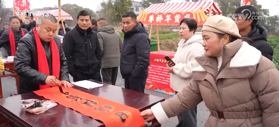 在江西上饒市廣信區(qū)尊橋鄉(xiāng),年貨市集人頭攢動(dòng)。攤位上年貨品類豐富,當(dāng)?shù)氐臅◥酆谜攥F(xiàn)場(chǎng)寫春聯(lián)、送福字,墨香四溢。