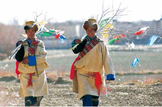 新年慶典活動,在正月初一天亮之前就開始了。早晨兩三點(diǎn)鐘,女主人要到附近的神泉和圣河里去背頭輪水。傳說大地之王辛赤曲杰除夕之夜要把雪山獅的奶灑在江河的源頭,誰最勤快,誰起得最早,誰能背到頭輪水,誰就有福氣、有財運(yùn)。