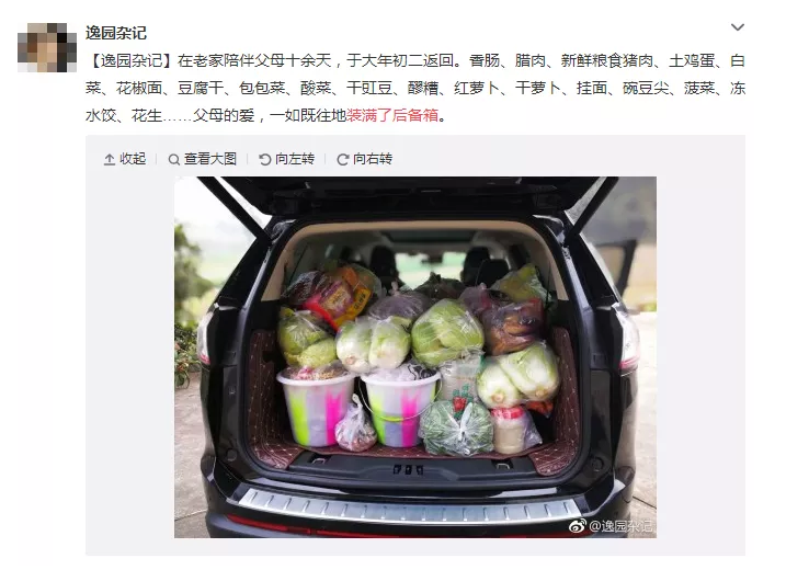 昨日,游子們從家這個港灣里,鳴笛啟航,奔向遠方。除了對鄉(xiāng)愁的百轉千回,更有親情的濃郁化不開。這幾天,網友們都在微博里曬圖,“媽媽給裝的后備箱”的話題,一時成了熱點——“親手做的馬蹄糕”“最愛的家鄉(xiāng)小柚柑”“一大罐子土榨花生油”“秋天腌的糖蒜”……后備箱被爸媽塞得滿滿的,不愿帶還不高興。于是乎,調皮的網友留言:“明年我開個貨車回來過年!”